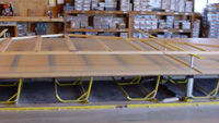 The Ejection Systems for use with our Walk-thru Table design and our Continuous Table design are sectionalized. Each section includes one table-width length lifting bar and its lift mechanism. The bar rests on the table, flush with the working surface. On command the lift mechanisms, located beneath the table, rotate into position and raise the bar(s). The bar(s) in turn raise the truss clear of the jigs. “Sections” are normally purchased in sets of two, but can be purchased singly. Any number of sections can be linked to work in unison.